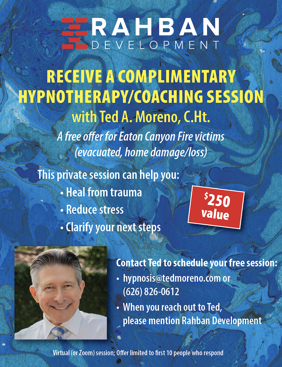 With a background in crisis counseling, we know how important mental health is as part of the recovery process. That's why Rahban Development is sponsoring free hypnotherapy sessions for Eaton Fire victims with Ted A. Moreno, C.Ht. The private sessions can help victims heal from trauma, reduce stress, and clarify next steps.